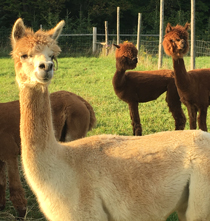 Alpacas before shearingIn the springtime, our alpacas are sheared by a local professional shearer. Although the alpacas do not necessarily like being handled and sheared, they are not harmed and it is generally not an unpleasant experience for them. They are strapped to a table with 3 or 4 helpers: one has the head to hold gently but firmly, and a few to hold down the front legs and the back legs.